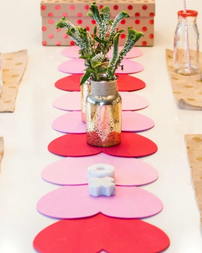 Foam hearts are turned into a creative table runner using simple craft techniques. Because the materials are easy to find, this runner is both affordable and stylish. It adds texture and color to Valentines Day Table Decorations while still feeling light and handmade.