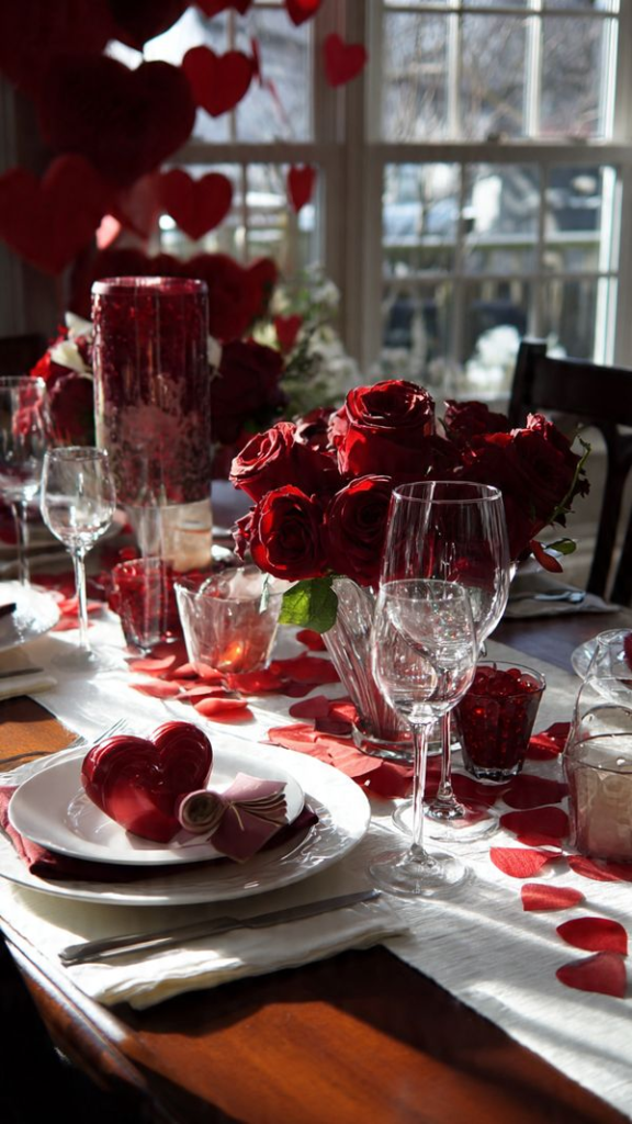 This idea uses neatly folded napkins shaped like envelopes to create a playful yet elegant table detail. Paired with fresh tulips, simple vases, and a red-and-white table runner, the setup feels cheerful without being too bold. It’s a balanced way to add personality to Valentines Day Table Decorations while keeping the table clean and inviting.