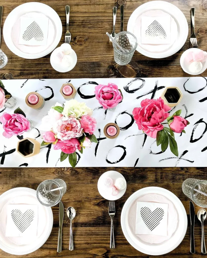 A modern table runner made from white paper and black paint creates a bold yet minimal design. When paired with candles and roses, it adds contrast while keeping the overall look subtle. This idea suits those who prefer clean and contemporary Valentines Day Table Decorations.