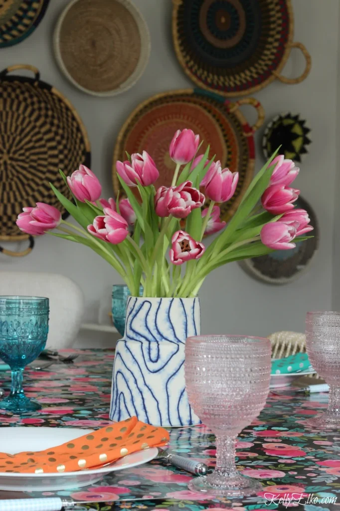 Tulips are an affordable and colorful flower choice that instantly brightens the table. Styled in a unique vase, they create a cheerful centerpiece with minimal effort. Paired with wrapping paper runners and colorful glassware, this idea keeps Valentines Day Table Decorations fresh and lively.