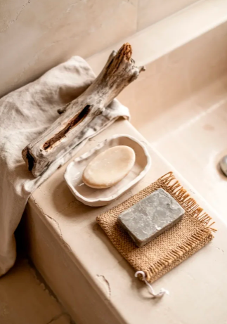 Together, the sink and plaster wall create a clean and harmonious composition. The simplicity of both elements allows the natural materials to stand out without overwhelming the space.