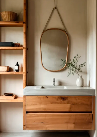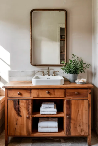 In Wabi Sabi Bathrooms, the goal is not to create a perfectly arranged display but to allow useful objects to naturally become part of the design. A weathered wooden vanity combined with simple open shelves can achieve that balance while adding warmth and functionality to the space.