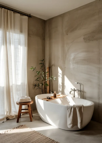 The contrast between the soft plaster and the smooth surface of the tub adds visual interest. At the same time, the overall look remains calm and uncluttered.