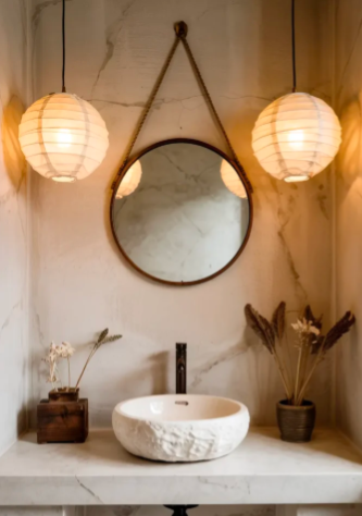By using soft lantern lighting, Wabi Sabi Bathrooms can feel more like a peaceful retreat. The gentle glow creates a soothing setting that encourages relaxation and adds a sense of tranquility to everyday routines.