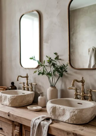 Natural materials and finishes are essential in Wabi Sabi Bathrooms, and the combination of aged brass fixtures with stone sinks works beautifully together. Brass develops a natural patina over time, which adds depth and character instead of looking worn out. This aging process fits perfectly with the idea of appreciating materials as they change.