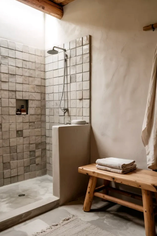 Using tiles like these in Wabi Sabi Bathrooms adds personality and softness to the design. The result is a bathroom that feels unique and inviting rather than overly polished.