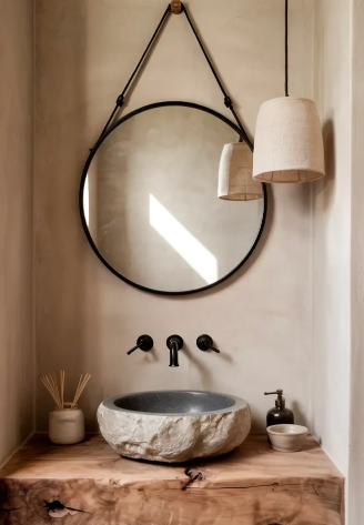 To keep the focus on the materials, simple mirrors work best. A frameless or minimal mirror design prevents the space from feeling cluttered and allows the stone basin to remain the centerpiece.
