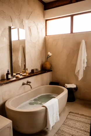 When paired with a freestanding bathtub, the entire bathroom begins to feel more like a peaceful retreat. A sculptural tub placed against textured walls becomes a focal point while still maintaining the quiet simplicity of the design.