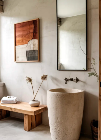 In Wabi Sabi Bathrooms, combinations like this emphasize authenticity. Rather than focusing on polished perfection, they celebrate materials that naturally age and develop character over time.