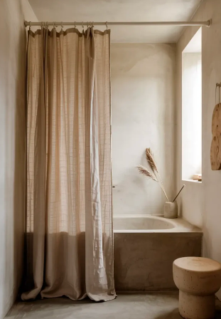 Natural fabrics are an important element in Wabi Sabi Bathrooms, and linen shower curtains are a simple way to introduce softness into the space. Linen has a relaxed texture that feels effortless while still looking refined.