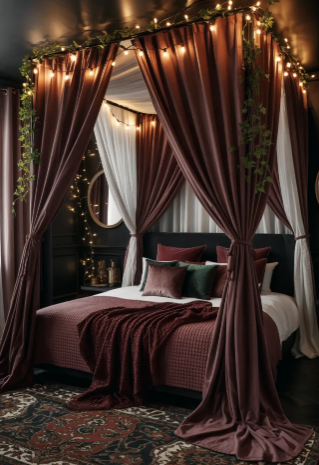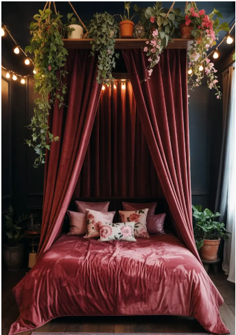 The finished room feels bold, romantic, and welcoming at the same time. This type of design is perfect for anyone who wants Whimsical Bedroom Ideas with a slightly dramatic edge.