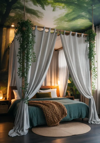 One of the most magical Whimsical Bedroom Ideas is creating a space inspired by a forest setting. Bringing natural elements indoors can instantly make a bedroom feel calm, mysterious, and relaxing. Shades of deep green paired with wooden textures help create that woodland atmosphere, especially in rooms that receive natural sunlight during the day.