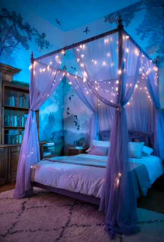 Adding a canopy bed with light, flowing fabric helps soften the overall design while reinforcing the dreamy theme. Sheer curtains around the bed can create a gentle, cocoon-like look that feels both private and magical.