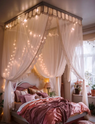 A romantic bedroom design often combines softness with elegance. In many Whimsical Bedroom Ideas, sheer curtains and delicate fabrics help create a gentle and dreamy atmosphere.