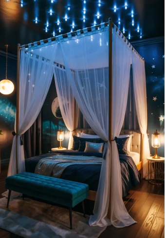 Decor pieces such as sheer curtains, star-themed accents, or layered fabrics can strengthen the dreamy aesthetic. Together they create a bedroom that feels imaginative yet comfortable.