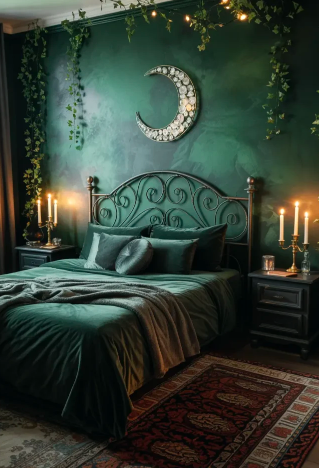 Dark jewel tones can create a magical nighttime atmosphere inside a bedroom. In many Whimsical Bedroom Ideas, shades like emerald or deep teal provide the perfect background for glowing accents.