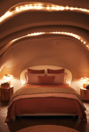 A cocoon-inspired bedroom focuses on comfort and warmth. This style within Whimsical Bedroom Ideas uses soft curves, natural tones, and layered textures to create a relaxing environment.