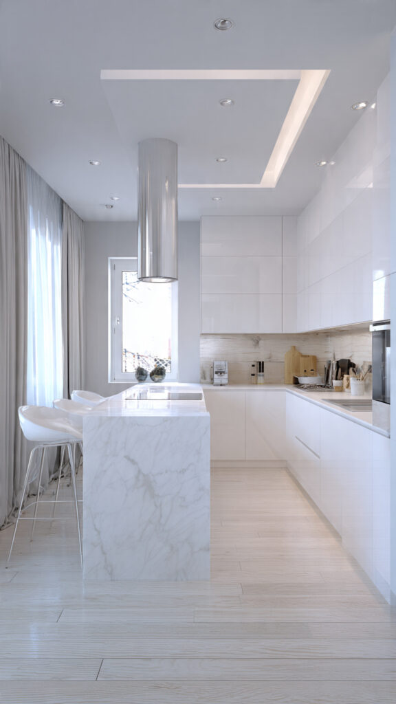 Beyond color and materials, the layout of a white kitchen strongly influences how it feels and functions. Smart planning ensures the space looks organized and open instead of cluttered.