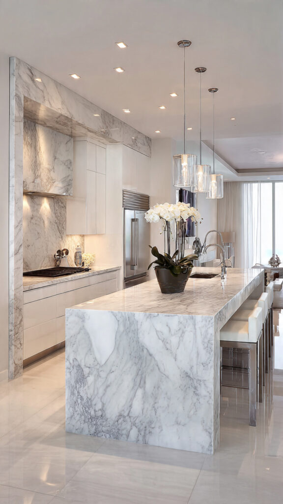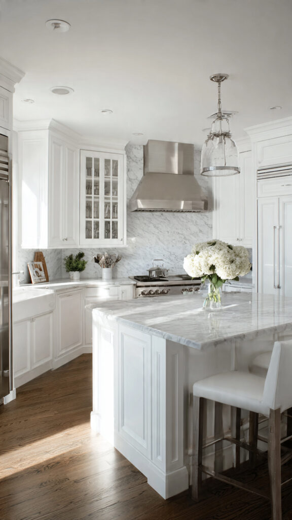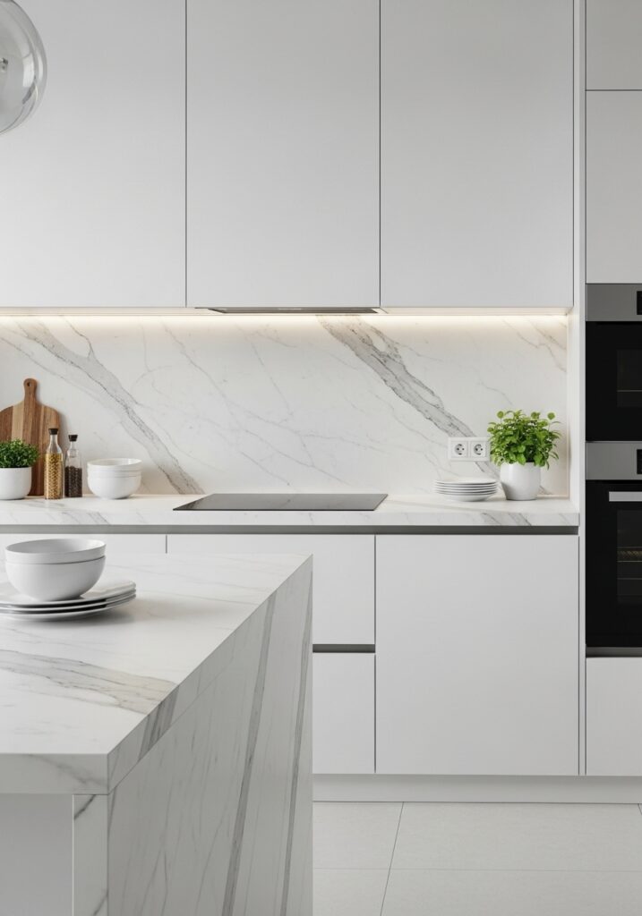 Marble has long been associated with elegance, and its natural veining introduces subtle contrast into a white kitchen. The soft gray patterns break up large white surfaces without overpowering the room. For homeowners concerned about upkeep, modern alternatives like quartz offer a similar appearance with less maintenance. Using a continuous slab for backsplashes or countertops creates a smooth, high-end look that is also practical for daily use.