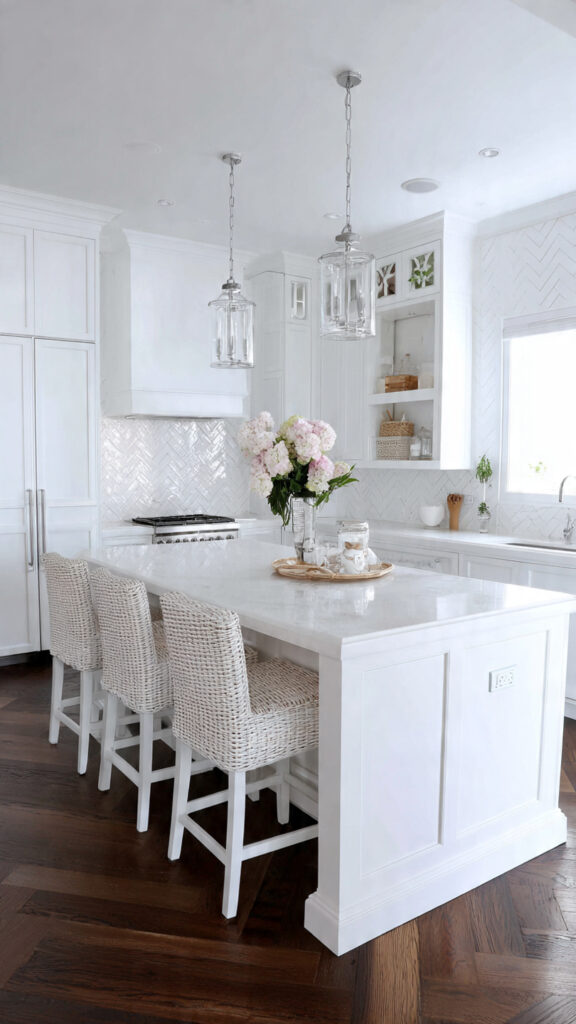 A successful white kitchen relies on more than paint color alone. Texture plays a major role in preventing the space from feeling flat or one-dimensional. When different materials are layered together, they add depth and keep the design visually engaging. Mixing surfaces, finishes, and natural elements helps white kitchens feel lived-in rather than sterile.
