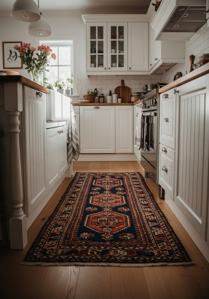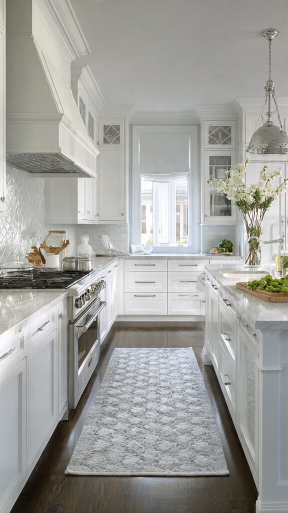 Rugs add comfort, color, and pattern to white kitchens. They soften hard surfaces and help define walkways. A well-chosen runner can introduce visual interest without overwhelming the overall design.