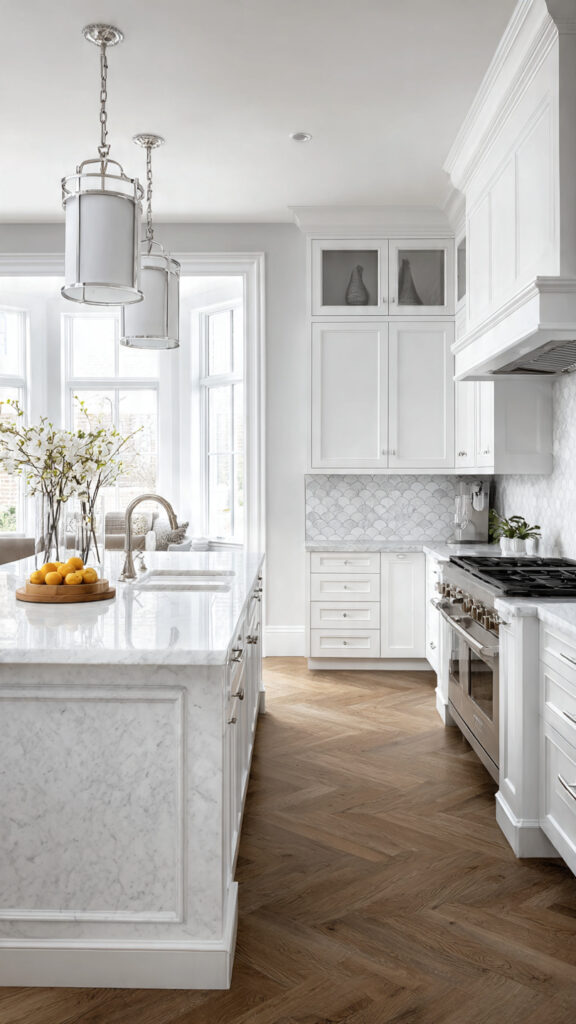 Traditional white kitchens feature detailed cabinetry, decorative molding, and timeless fixtures. These kitchens feel elegant and familiar, offering a sense of comfort that never goes out of style.