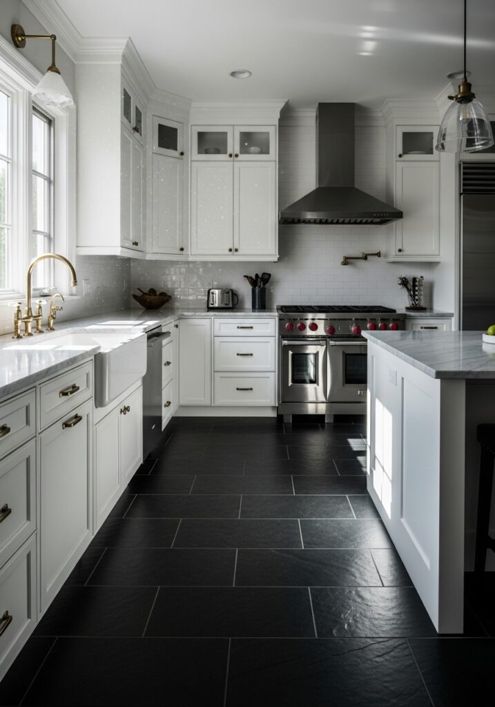 Dark flooring provides a strong foundation for white kitchens. Materials like slate or deep-toned wood create contrast that helps white cabinetry stand out. This balance keeps the space from feeling washed out and adds a sense of structure and stability.