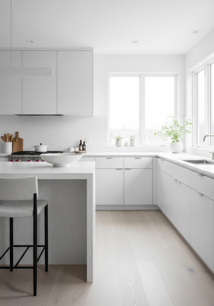Minimalist white kitchens focus on clean lines, flat surfaces, and uncluttered layouts. Hidden hardware and streamlined finishes create a calm, polished look that feels intentional and modern.