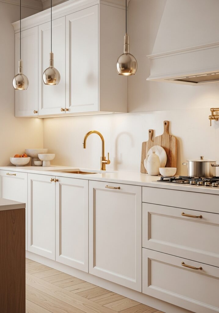 Warm metallic finishes like brass or gold bring elegance and softness to white kitchens. These tones reflect light beautifully and prevent the space from feeling too cool. Over time, these finishes develop character, making them a timeless choice.