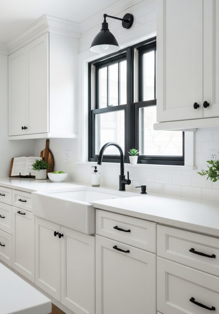 Hardware might be small, but it has a big impact on overall design. Matte black knobs, pulls, and faucets create sharp contrast against white cabinets. This choice instantly modernizes the space and gives it a clean, polished finish without overwhelming the design.
