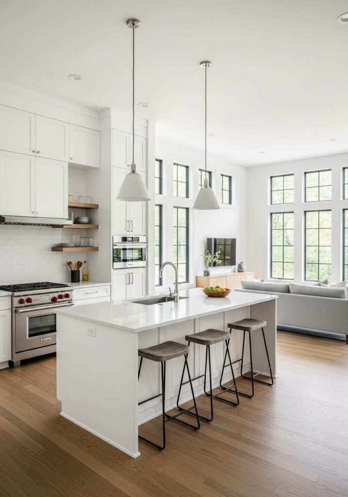 White kitchens work especially well in open-concept homes because they reflect light and make spaces feel larger. Clear sightlines help the kitchen blend seamlessly with nearby living areas. Careful planning keeps the space flowing naturally without feeling chaotic.