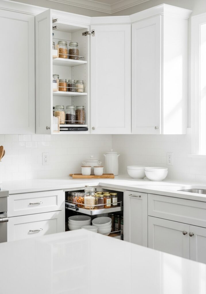 Poorly designed corners can quickly make white kitchens feel cluttered. Solutions like lazy Susans or pull-out drawers improve storage and accessibility. Keeping cabinets organized helps maintain the clean look that white kitchens are known for.
