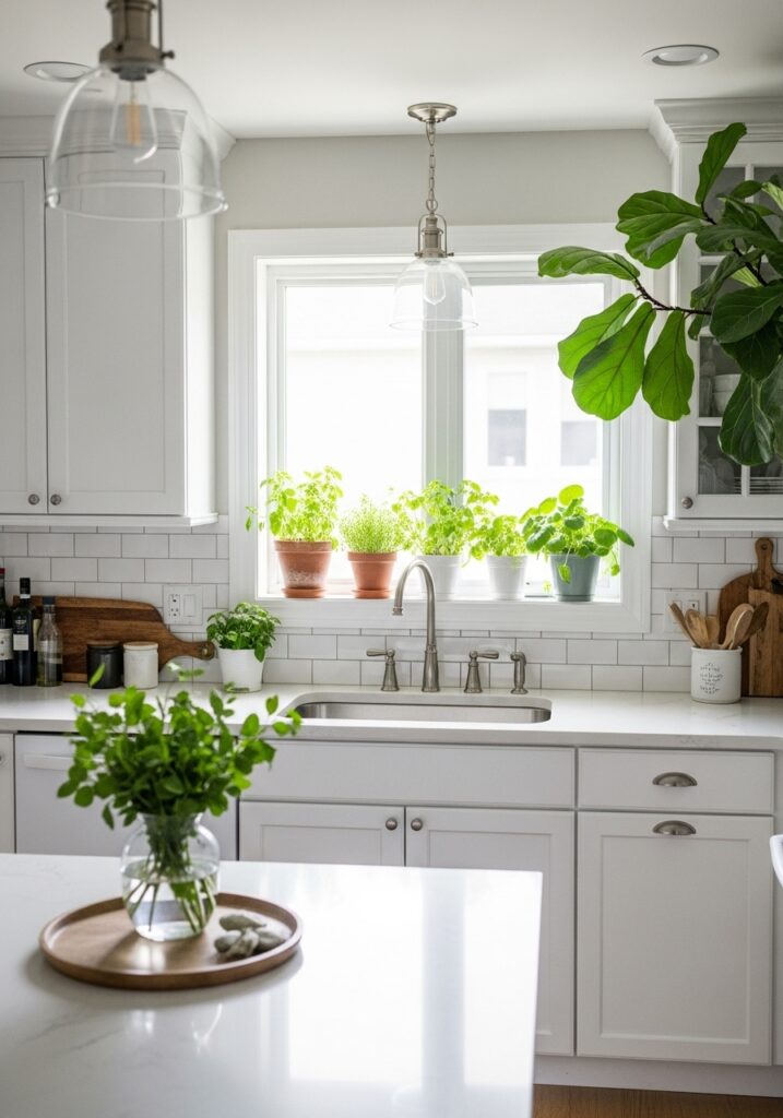 Plants instantly breathe life into white kitchens. The contrast between green leaves and white surfaces creates a fresh, natural look. Whether real or low-maintenance varieties, greenery prevents the space from feeling too stark.